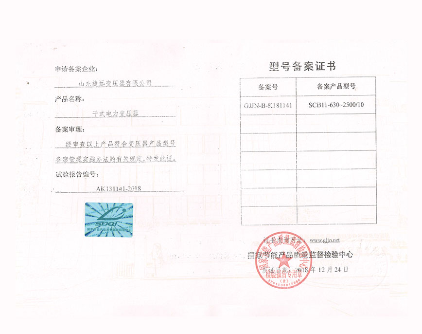 干式電力變壓器型號備案證書