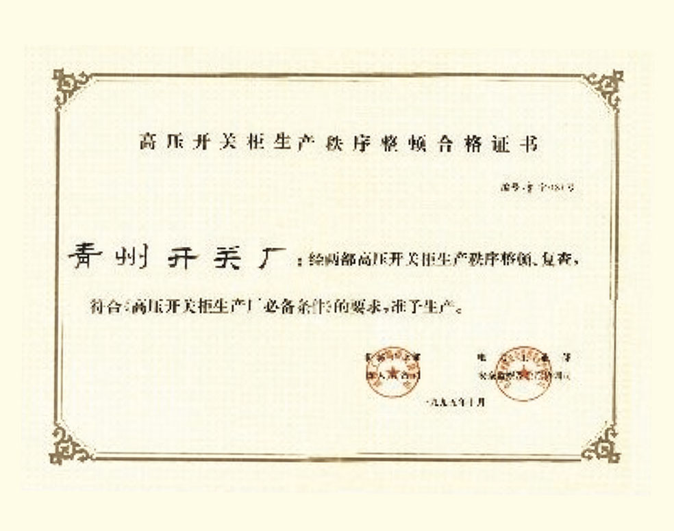 低壓成套開關設備生產秩序與產品質量整頓合格證書